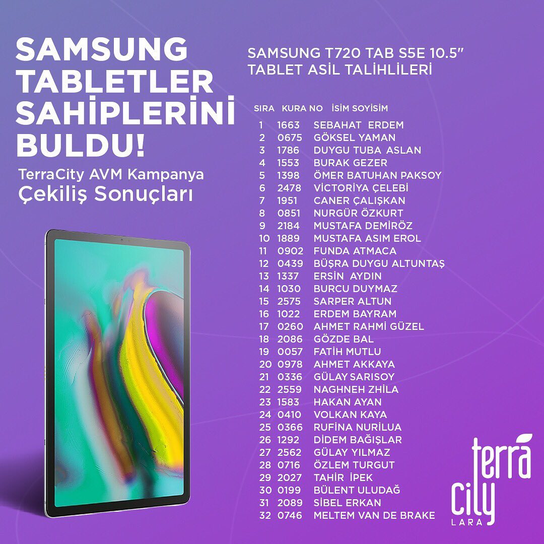 TerraCity AVM Çekiliş Sonuçları. 28 Kasım 2020 tarihinde Noter huzurunda gerçekleşen Samsung Galaxy Tab S5e tablet çekilişinde belirlenen asil ve yedek talihliler açıklandı.