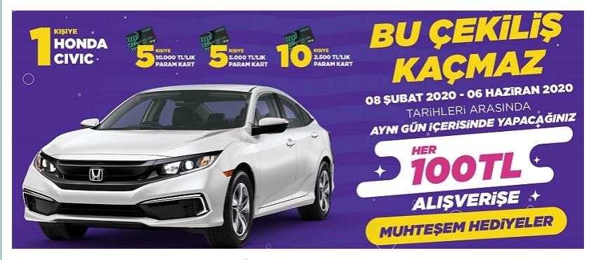 Çekiliş Sonucunda; 1 Kişiye Honda Civic otomobil, 5 Kişiye 10.000 TL Değerinde Param Kart, 5 Kişiye 5.000 TL Değerinde Param Kart, 10 Kişiye 2.500 TL Değerinde Param Kart hediye edilecektir.