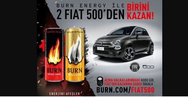 Burn Fiat 500 Çekilişi sonucu. 04.10.2021 – 31.12.2021 Kampanya tarihleri arasında, Türkiye genelindeki tüm satış noktalarından Burn Orijinal 250 ml, 500 ml (4x250ml çoklu paketleri dahil) ,Burn Gold 250 ml, 500 ml (4x250ml çoklu paketleri dahil) kampanyalı açma halkalı ürünlerinden satın alarak ürün açma halkalarının altlarından çıkan şifreyi ad, soyad, adres ve telefon no bilgileriyle birlikte burn internet sitesine giren Bireysel müşterilere 250 ml için 1, 500 ml için 2 çekiliş hakkı verildi.