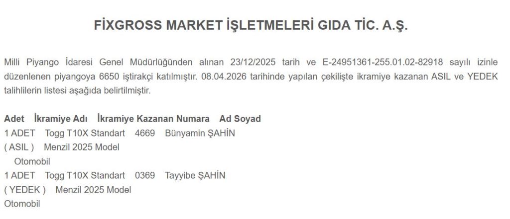 Fixgross Market Çekiliş Sonuçları… FİXGROSS MARKET İŞLETMELERİ GIDA TİC. A.Ş.