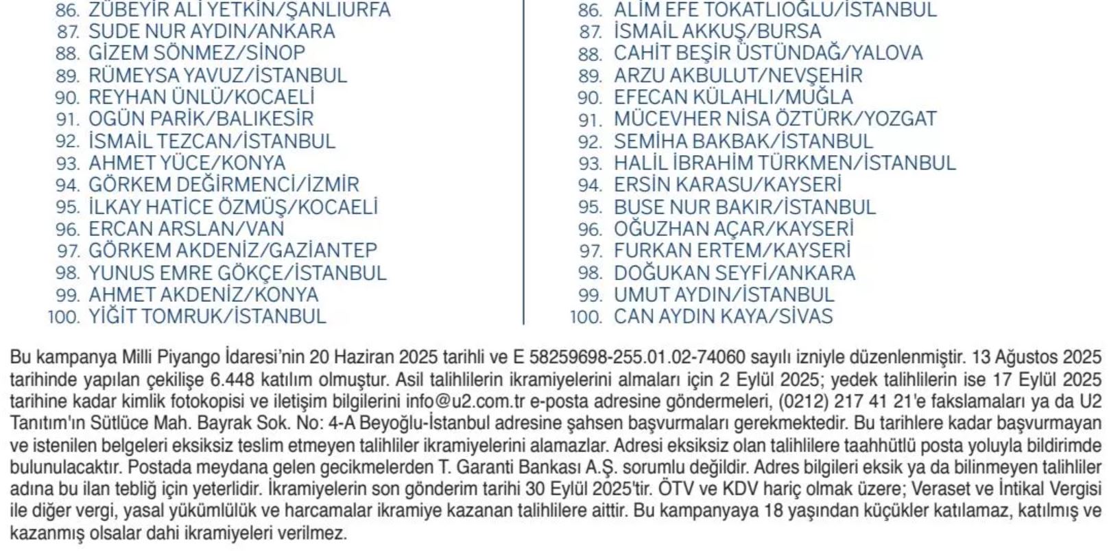 Asil talihlilerin 02.09.2025, yedek talihlilerin ise 17.09.2025 tarihine kadar kimlik fotokopileri ve iletişim bilgileri ile info@u2.com.tr mail adresine, 0212 217 41 21 nolu faksa ya da U2 Tanıtım’ın Sütlüce Mah. Bayrak Sok. No:4-A Beyoğlu-İstanbul adresine şahsen başvurmaları gerekmektedir. Bu tarihlere kadar başvurmayan ve istenilen belgeleri eksiksiz teslim etmeyen talihliler ikramiyelerini alamazlar.